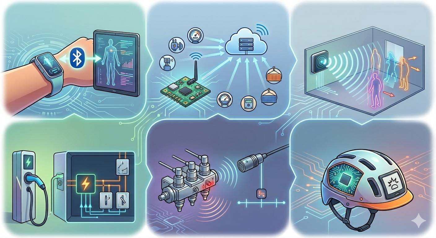 Portefeuille de prototypes R&D : dispositif médical de mesure d'impédance BLE, modules télémétrie LTE-M/NB-IoT, système de détection de personnes par radar mmWave 60 GHz, hardware de supervision de charge VE (Modbus + relais), détection de pannes de buses par mesure vibratoire sur bus CAN, Systeme détection de chocs pour casque basse consommation avec afficheur e-ink.